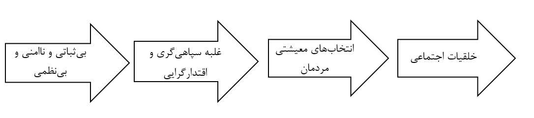 2. فراستخواه روند علت‌و معلولی جامعه ایران را به صورت شماتیک زیر نشان می‌دهد: