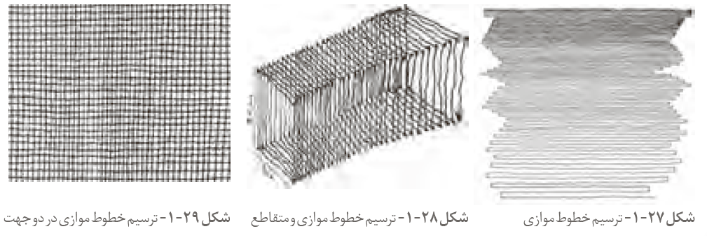 1.با دست آزاد و بر روی یک کاغذ مکعبی به ابعاد تقریبی 4*4*4 سانتی متر ترسیم کنید. بر روی یک ×4× مکعبی به ابعاد تقریبی 4 ،A 1 با دست آزاد و بر روی یک کاغذ 4 30 با خطوط کمرنگ ترسیم کنید. کدام یک از حالت های × 30× روزنامه باطله بزرگ مکعبی با ابعاد تقریبی 30 دست برای انجام طرح های فوق مناسب است؟ برای دادن جواب می توانید مجدداً تجربه کنید. حال خطوط مکعب های ترسیم شده را پررنگ کنید. حالت دست و نحوۀ استفاده از مداد چه تغییری می کند؟ هر کدام از شما ممکن است به شیوۀ خاصی از ابزارها استفاده کرده و خطوط را ترسیم کنید. حرکت مچ، حرکت آرنج، حرکت بازو، حالت قلم در دست را در تمامی تمرین های بیان شده مورد ارزیابی قرار دهید و نتایج به دست آمده را در کلاس مورد بحث و بررسی قرار دهید. میزان پیشرفت، نحوۀ تسلط و نقاط ضعف خود را در جدولی فهرست نمایید و کارهای لازم جهت بهبود شرایط موجود خود را ارزیابی و از هنرآموز خود راهنمایی بخواهید.